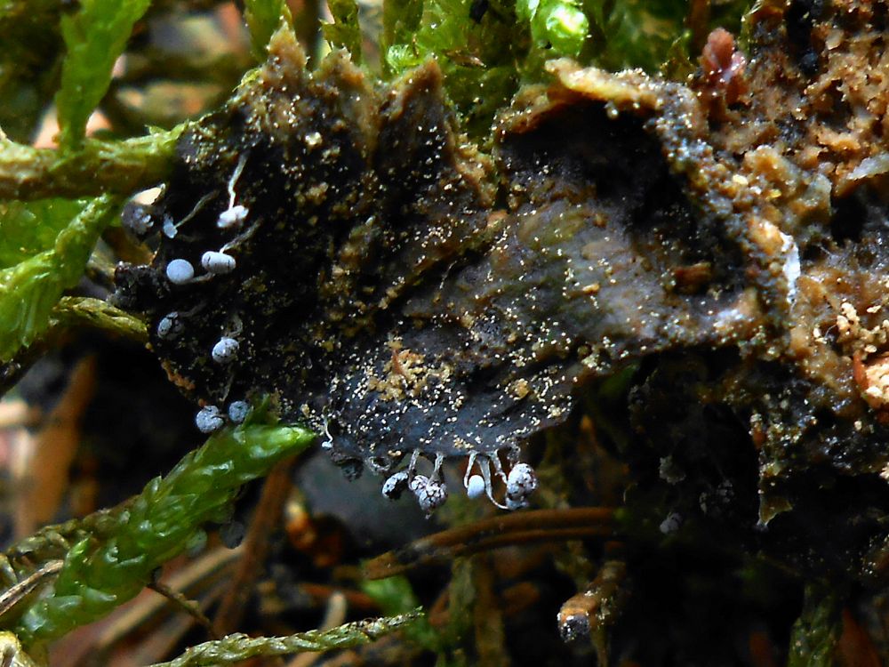 Není to badhamovka (hlenka)? Ten černý mřižkovitý vzorek vypadá podobně, jako rozpraskaná krusta na badhamovkách, velikost taky podobná. Co je vlastně za hmotu to černé - zetlelé listí, šupiny šišky, ...?