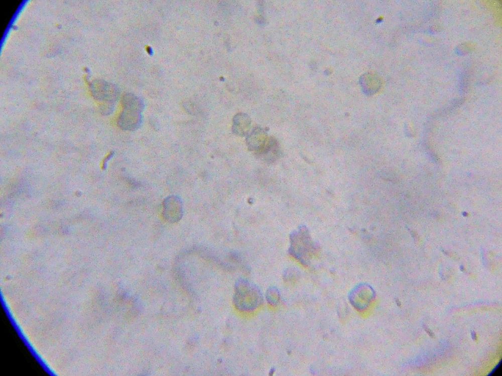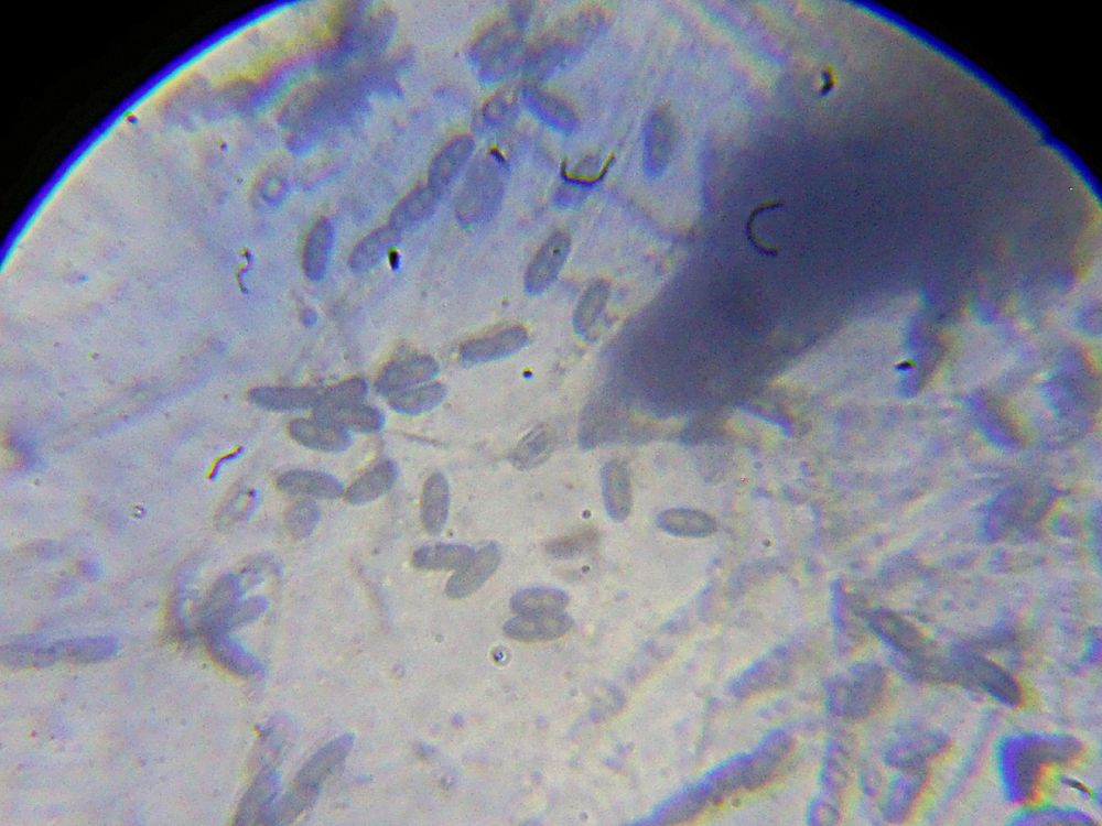 Právě jsem to zmikropoval a máte zjevně pravdu. Tyto útvary, které jsou na fotce, jsem tam našel znova, byly tam stejně jako předtím hojně obsažené, ale všiml jsem si, že někde tvoří i větší celky, což neodpovídá výtrusům. Ovšem mohlo by to být také něco, co patří k té houbě ?