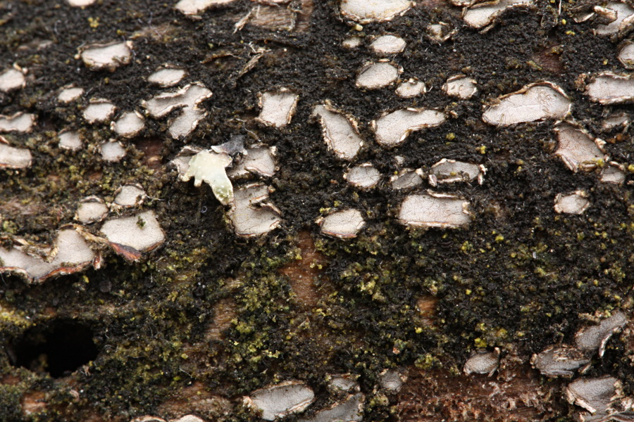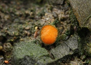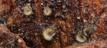 na jednu mou oblíbenou lokalitu mě příjemně překvapil. Po několika různobarevných a zatím neurčených (možná i nikdy neurčených) chlupáčcích na stoncích suchých bylin jsem poprvé viděla růst Mollisii na modřínové šišce. Druhů rostoucích na šiškách jehličnanů je ovšem několik, a jelikož tahle neměla ještě ani vyvinutá vřecka, zůstane opět jako "sp.". :-/ Okolo plodniček jsou pěkně vidět dlouhé provázky buněk subikula, což je ten plstnatý kobereček, na kterém některé Mollisie/Tapesie rostou. (Co se týká rodového názvu, následuji A. Gmindera a oba rody nerozlišuju, užívajíc jednotně Mollisia.)