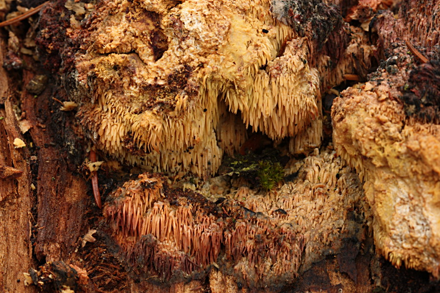 Na odloupnuté kůře ovocného stromu a na kmeni pod ní rostla hrotnatka zápašná (Sarcodontia crocea). Moc pěkná ježatá houba nezaměnitelné barvy i vůně.