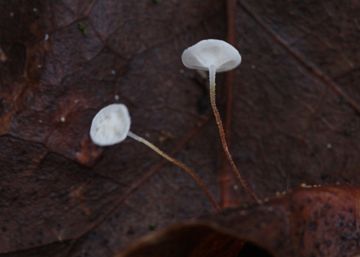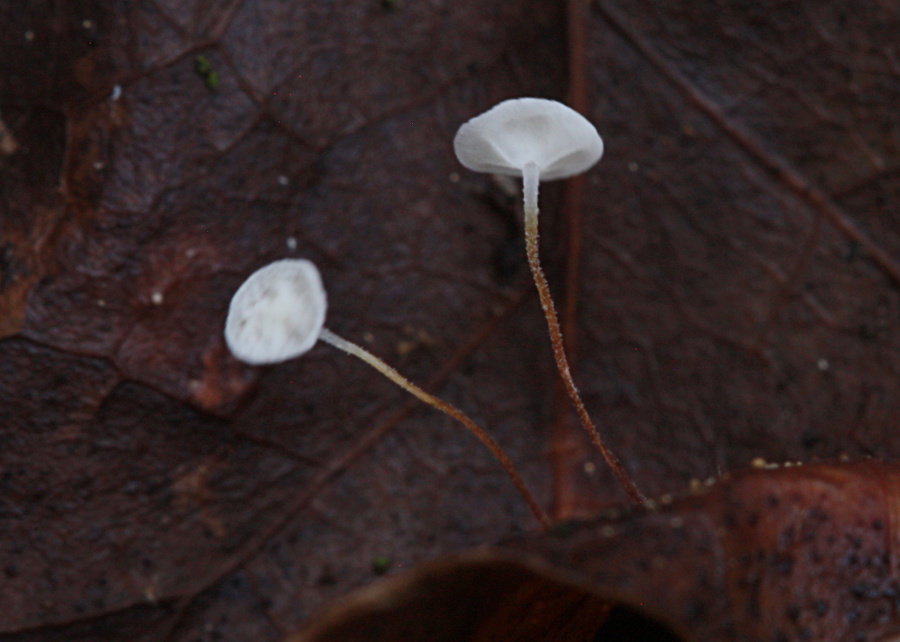 A na závěr jedna, co se tu za poslední cca měsíc objevila tolikrát, že vás určitě musí už nudit - špička břečťanová. Ve vysoké vrstvě břečťanového porostu zasypaného jasanovým listím, lokalita ve zcela neudržovaném lesíku, závětří. Spolu s ní v opadu na jasanových listech a řapících rostly hojně bělavé až zažloutlé objekty, pravděpodobně sklerocia palušky Typhula phacorrhiza, které jsem už nefotila, protože mi byla zima a jel mi vlak.