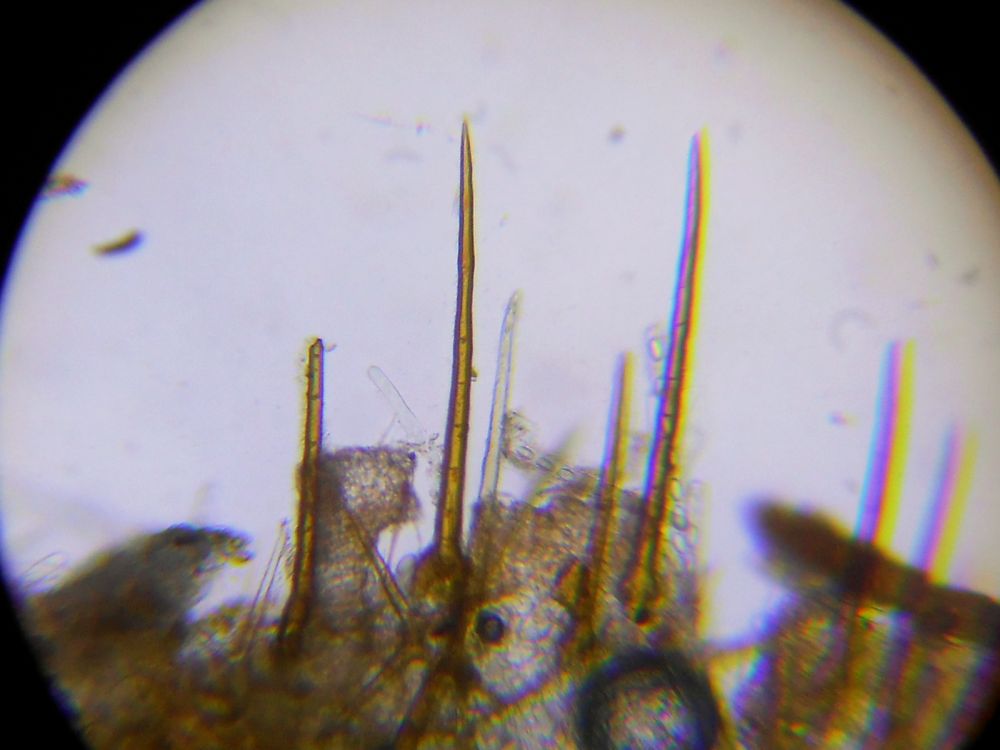 edit: Rozměry výtrusů by byly slabě nad rozsahem pro S. crucipila, to by se ještě dalo zdůvodnit rozdílem mezi živým a mrtvým materiálem, ale chlupy to už má o hodně delší (Schumacher pro ni udává 100–370 μ). Takže si myslím, i podle substrátu, že žlutěnka je o něco pravděpodobnější. Ale chtělo by to vidět ornamentiku, hm. Co se týká parafýz, u kosmatek vypadají cca všude stejně, u žlutěnek si to z hlavy nepamatuju.
