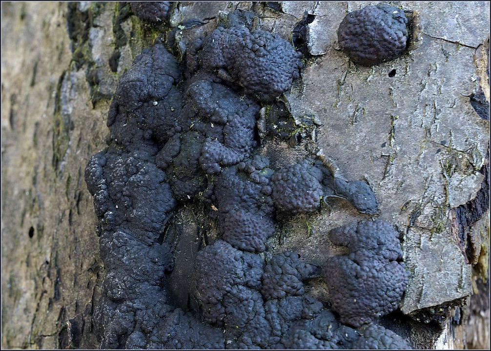 dřevomor různotvarý, Annulohypoxylon cf. multiforme. Když je černý objekt trochu mokrý, tak to někdy jde trochu do modra. Jinak pěkná fotka, stačí v počítači stáhnout modrou barvu na 0.