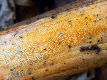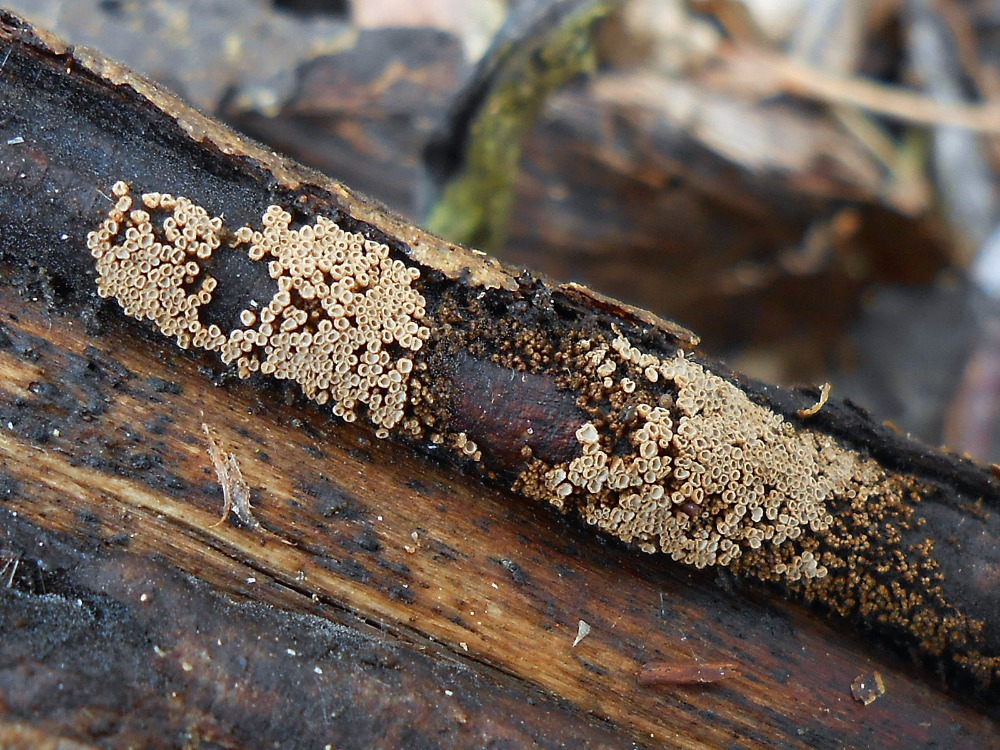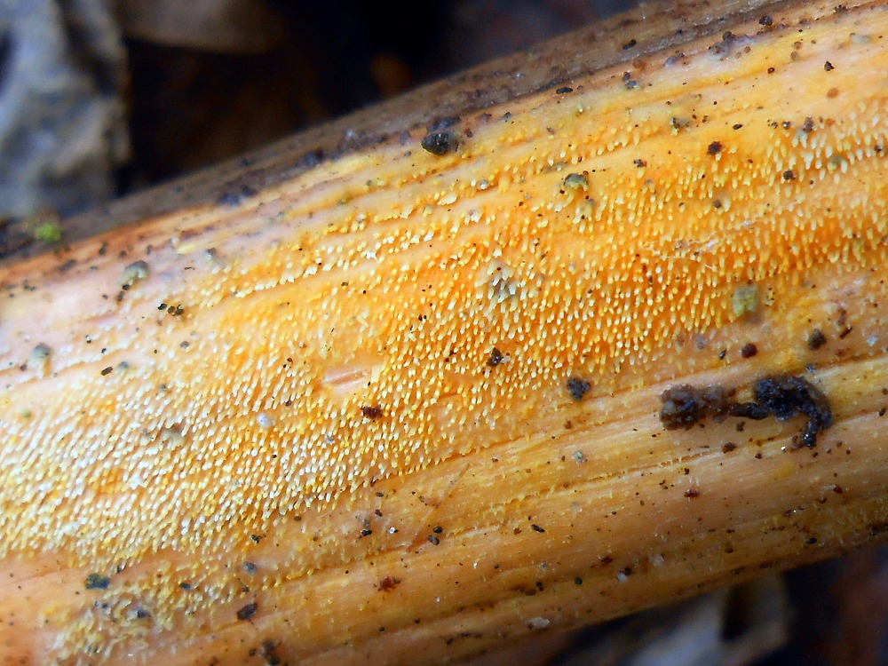 Číšovec nahloučený (Cyphellopsis cf. anomala), dost běžná houba (aspoň já ji nacházím celkem často), ale patrně přehlížená.