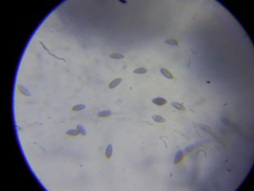 Výtrusy elipsoidní až vřetenovité, tmavé, s jednou nebo dvěma tukovými kapkami, 15 x 6-7,5 µm; vřecka oktasporická, zase tolik jsem se tím měřením nezabýval, změřil jsem jedno: 100 x 9 µm.