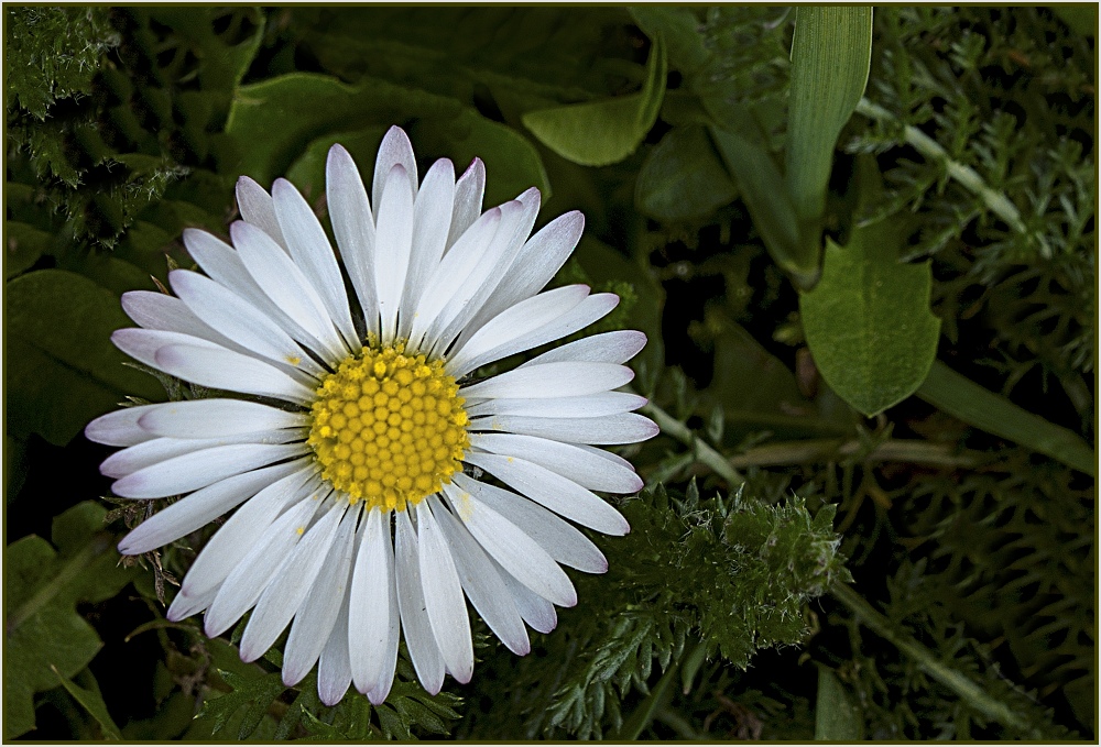 Když jsem fotila tuto sedmikrásku, tak jsem ostřila na dolní část a žlutý střed není ostrý.