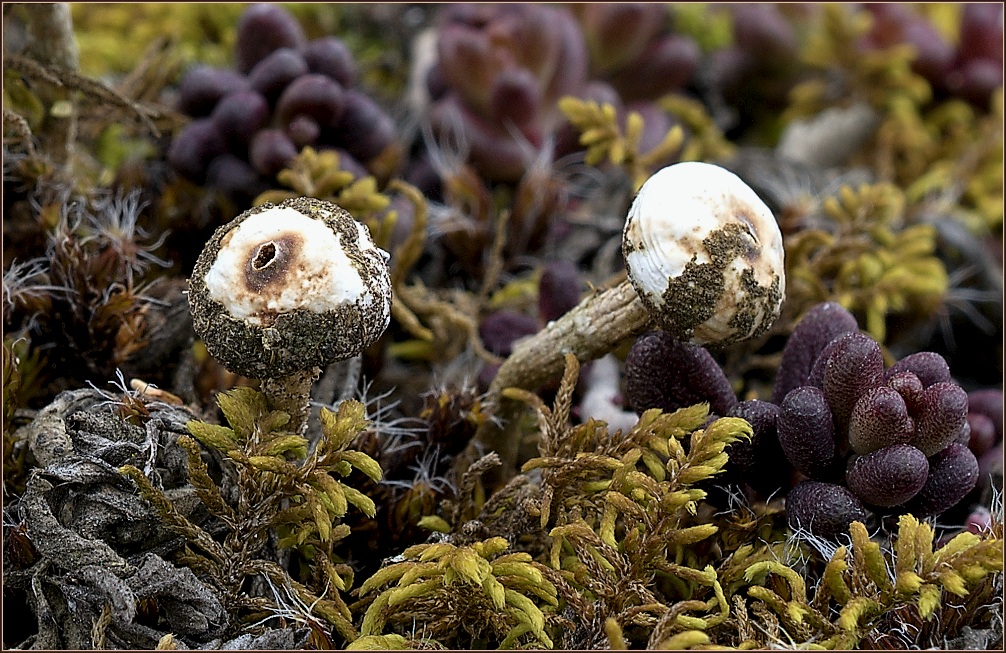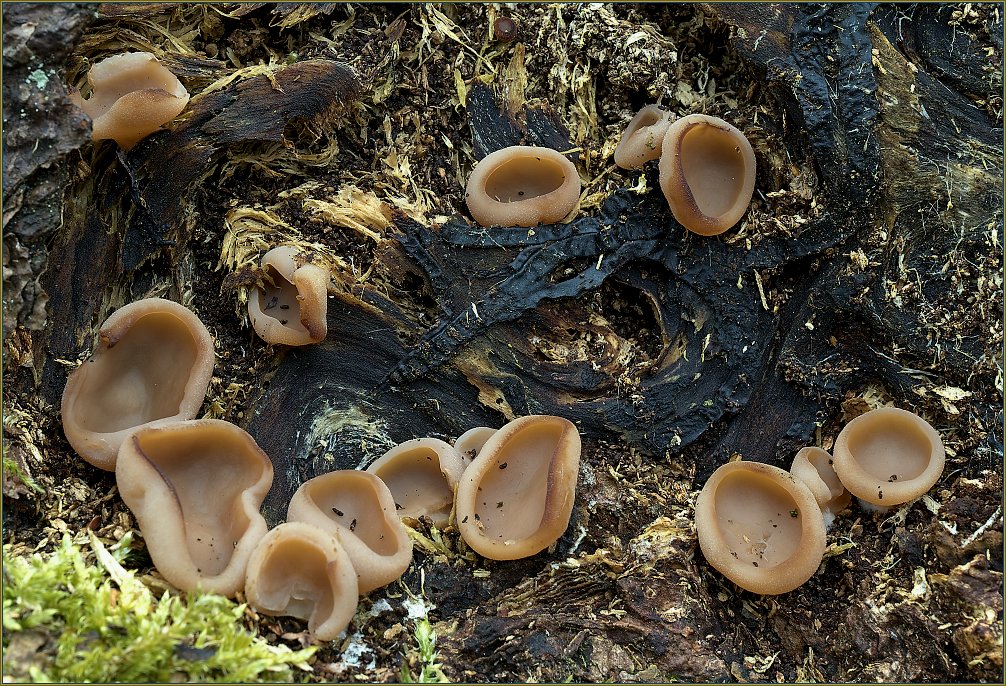 Krásná skupinka. Tam nahoře vidím ale ještě nějakou jinou malinkou vřeckatou tmavě hnědou houbičku.