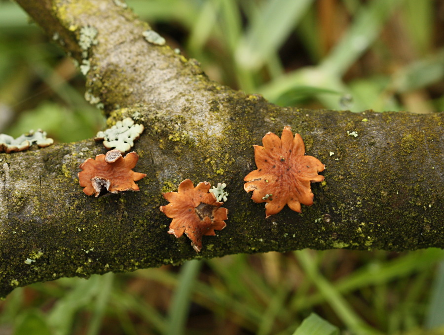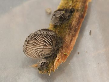 A jako bonus mě - kromě destic, několika ucháčů a spousty ušisek - potěšila tahle zatím neurčená štětinatá hlívička (asi) z rodu Hohenbuehelia. (Na původním klacku se fotit nedala, jílovitý svah, a vůbec je to spíš dokumentační fotka.) Tož dobrou s kobrou.