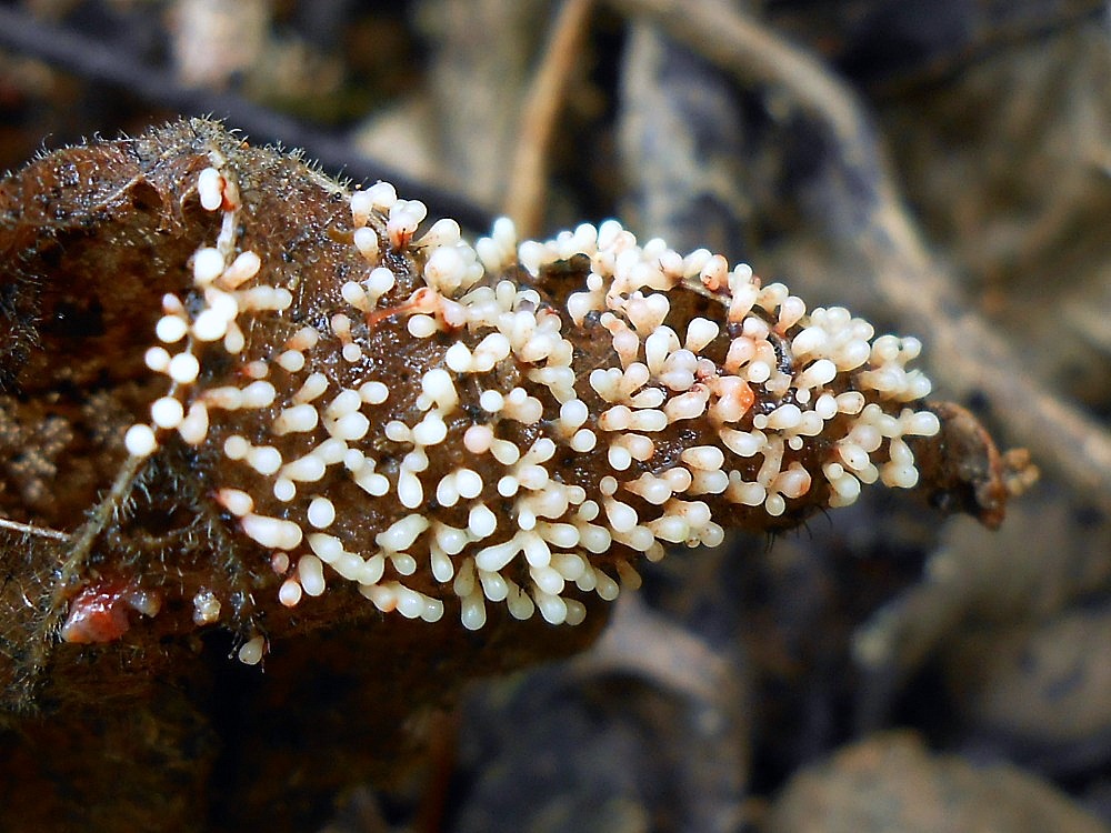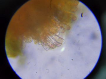 Výtrusy byly elipsoidní až kulovité, mírně bradavčité, 19-25 x 15-25 µm velké. Byly tam vidět také jakási vlákna, která byla různě propletená, a tyto útvary.
