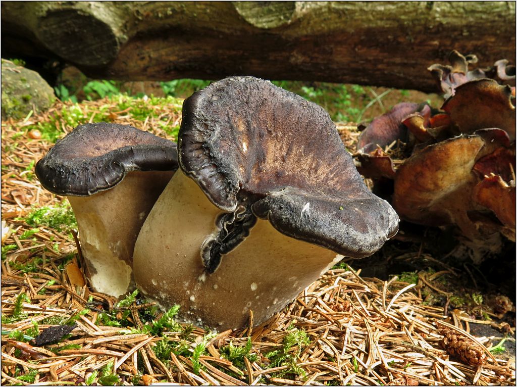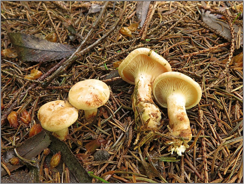 Tady bych také skoro tušil helmovky louhové, ale v úvahu připadají helmovky mléčné, mléko ovšem neronily. Rostly na rozpadající se větvi smrku v mechu u potůčku. Jak Vev konstatovala, momentálně je to potok.
