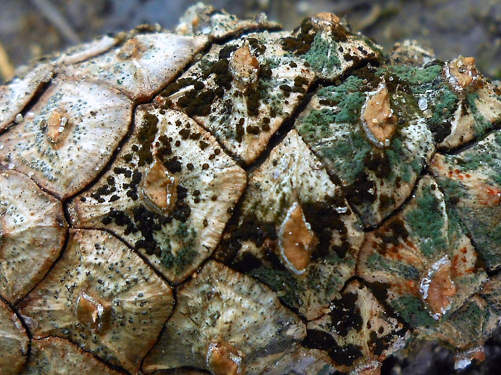 Zajímavé, při tomhle zvětšení bych tipla některý druh masenky (Hypocrea, to tmavohnědé + rezavé) a její anamorfu (Trichoderma, to zelené). Mikro nutné, nevím jestli i anamorfa. Mám klíče na druhy s bezbarvými a se zelenými výtrusy, kdyžtak si řekni.