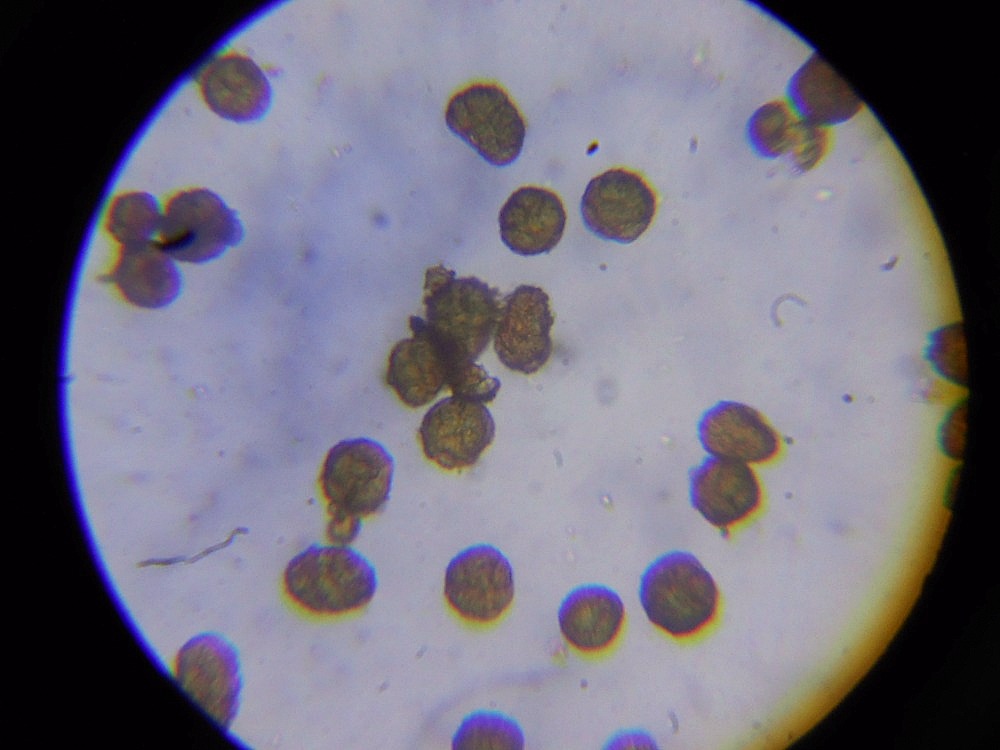 Výtrusy nepravidelné, tmavé, naměřil jsem hodnoty 18-22,5 x 15-20 μm.