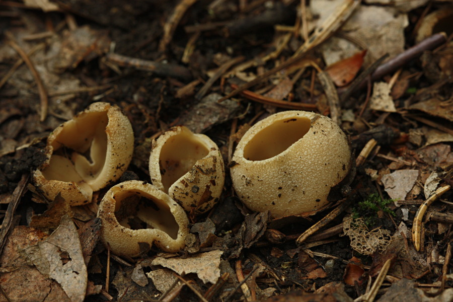 Přidám nějaké z minulého týdne z Litovelského Pomoraví ... Byla jsem zkontrolovat lokality, kde jsem před dvěma lety skoro přesně v týž den sbírala různé neurčené askouše (neurčené zčásti kvůli nezkušenosti, zčásti pro nezralost plodnic). Chřapáč Quéletův, jehož fotka za nic nestojí, tentokrát nebyl zarostlý plísní, takže můžu aspoň dokladovat lokalitu. Další chřapáče (costifera + crispa) se zatím neukázaly, na druhý je i ještě brzo. Tak aspoň konečně určené zvonkovky žlutavé (Tarzetta catinus), na chlup na stejném fleku co tehdy. Na plodnicích je pěkně vidět znak, který jeden francouzský mykolog považuje za typický pro tento druh a má na to lehce sprostou mnemotechnickou pomůcku - totiž perforované dno apotecia.