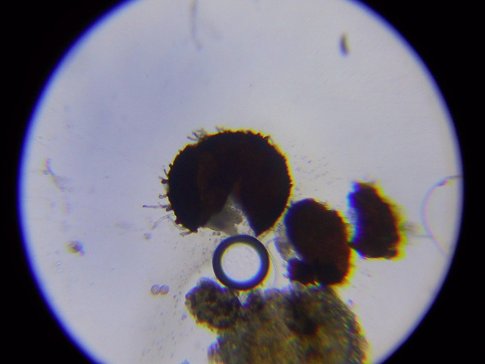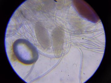 A ještě fotka výtrusů. Příliš jsem se měřením nezabýval, tak jenom pro představu jsem změřil jeden výtrus, který byl 85 x 34 μm velký.