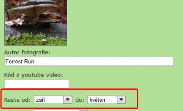 Při zakládáni nebo úpravě houby v atlasu přibyla možnost zadání období růstu. Pro otestování jsem s dovolením použil Forresťákovu hlívu, oprav si ji plz, pokud jsem zadal špatně