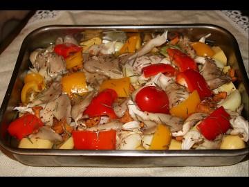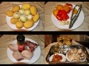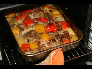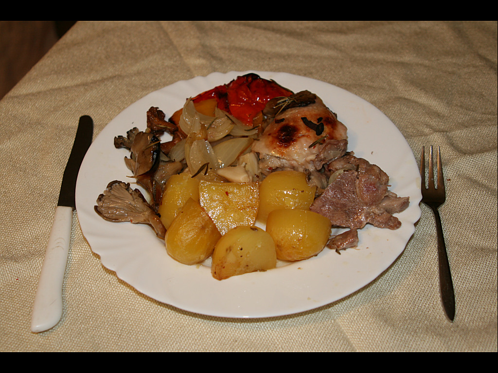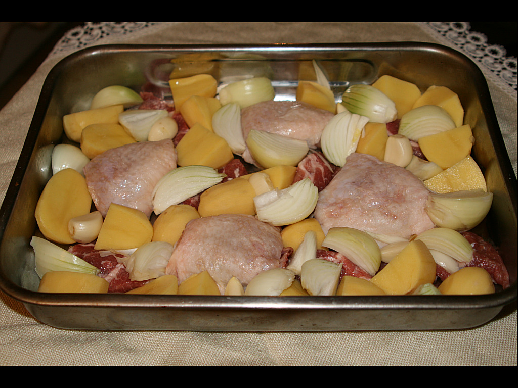 Tento recept má jednu zásadní výhodu a tou je minimum potřebného kuchyňského nádobí. Začneme tím, že mašlovačkou rezetřeme trochu olivového oleje po pekáčku. Pak vezmeme do rukou kuřecí kousky a posolíme ze všech stran. Stejně tak provedeme s kousky vepřové zeleniny. Na pekáček vše pokládáme prostorově podle vlastní úvahy - není k tomu potřeba žádný CAD systém. První vrstvu pekáčku doplníme rozprostřením na větší kusy rozkrájených brambor, celými stroužky česneku a na čtvrtky nebo pětinky rozkrájené cibule. Pak selektivně posolíme brambory. Teď jeden krok, který nesmí chybět. Ukazovákem levé nebo pravé ruky zakryjeme hrdlo lahve olivového oleje (jedině Extra Vergine) a pokapeme vše - brambory i maso. Skutečne pokapeme ! Ne utopíme ! Nezapomeňte je tam vepřová zelenina, možná i trocha tuku na kuřeti.