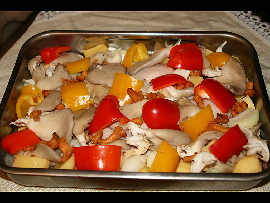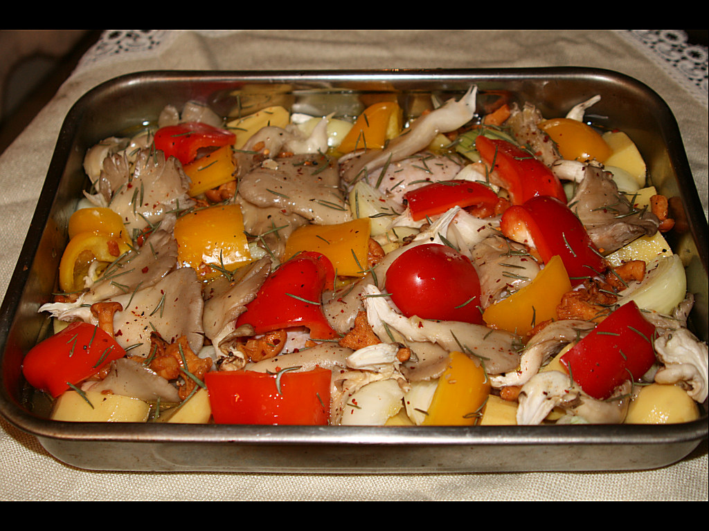 Jako další vrstvu použijeme houby. Pouze a jenom tvrdé houby, které při vaření neskončí "rozblemcnutím". K tomuto účelu se hodí zejména hlíva ustřičná včetně "nožiček", lišky - potřeba skrýt do první vrstvy, stroček trubkovitý stejně tak, boltcovka Jidášovo ucho stejně tak. Bombové jsou holubinky - mandlová, všechny typy zelené, ale i třeba mé oblíbené holubinky černající či sličné. Pokud nemáte nic z výše uvedeného nebo podobného, tak se pokloňte matičce přírodě, navštivte obchod a potupně si pořiďte třeba žampióny nebo hlívu ustřičnou. Tak jako já, protože hlíva z výpravy s Forrestem došla :(. Ovšem poslední zbytky vlastnoručně nasbíraných lišek jsem ještě v mrazáku našel. Doplňte pro chuť papriku, ale i jinou zeleninu např. cuketu nebo lilek. I tuto vrstvu "pokropíme" olejem. Nezapomeňte opět selektivně posolit.