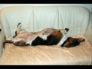 Pekáček je připraven k přesunu do trouby - elektrické či plynové. Zkušenosti mám pouze s plynovou. Ten, kdo vlastní elektrickou musí vše následné vybojovat sám. V plynové troubě uložíme pekáček do spodní třetiny a přikryjeme "flákem" alobalu nebo nějakým krytem, který umožní, aby se začalo dušením. Nastavíme "plný" chod, zapálíme, zavřeme troubu. A máme cca 1 hodinu až jednu a půl hodiny čas. Své tělo uvedeme např. do stavu "na záda" tak, jak to umí náš starší basset na připojeném snímku. Mohu vřele doporučit, neboť takto "uložený" basset dokáže zahřát záda a ledviny třem osobám před ním sedícím. Plně nahrazuje bahenní lázně poskytované např. v rašelinových lázních v Toušni mezi Čelakovicemi a Starou Boleslaví (vlastní zkušenost). V troubě se totiž neděje nic, co by se mělo pokazit. Maso, houby, brambory, cibule, papriky (cukety, lilek) pustí dostatek vody, aby se vše vařilo, dusilo ...