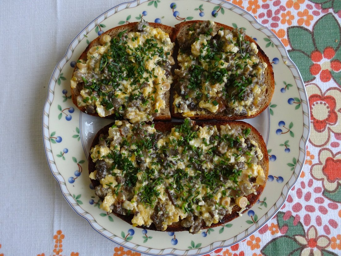 Na topinky naklademe vrstvu směsi, bohatě posypeme na drobno nasekanou pažitkou (medvědím česnekem) a pak už jen debužírujeme.
