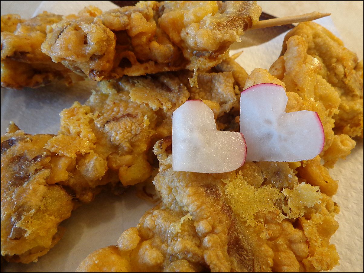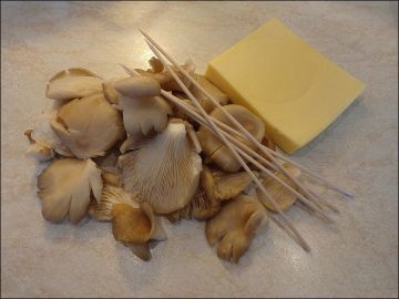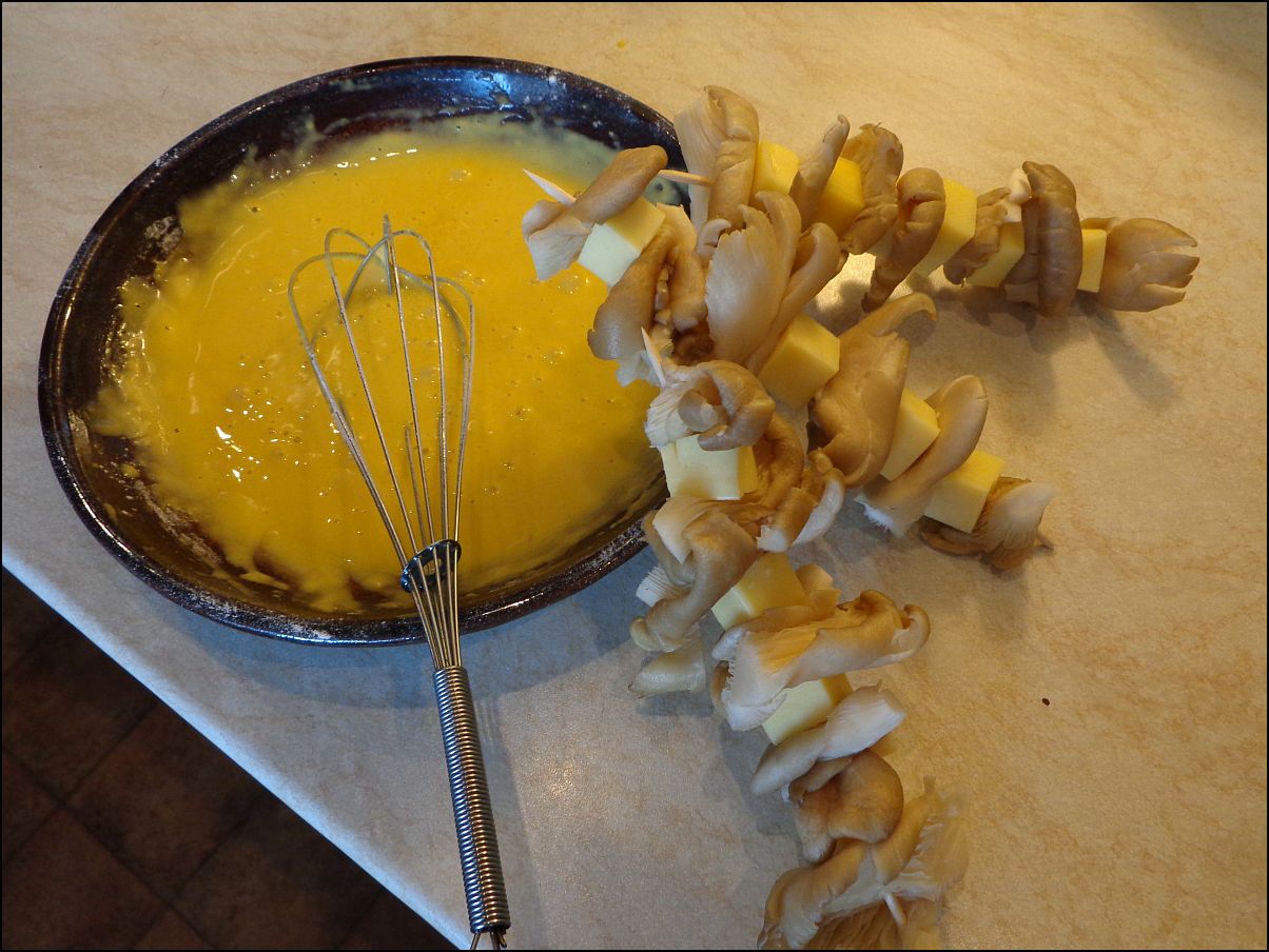 Na špejle napícháme střídavě hlívu s tvrdým sýrem. Z vajíček a mouky ušleháme těstíčko, ve kterém špízy obalíme.