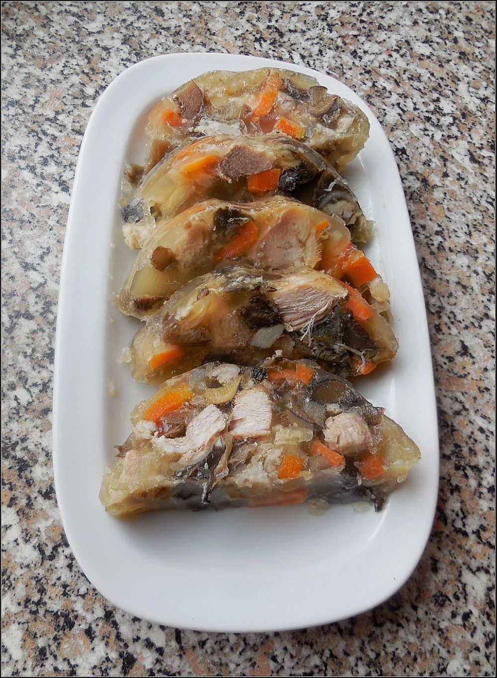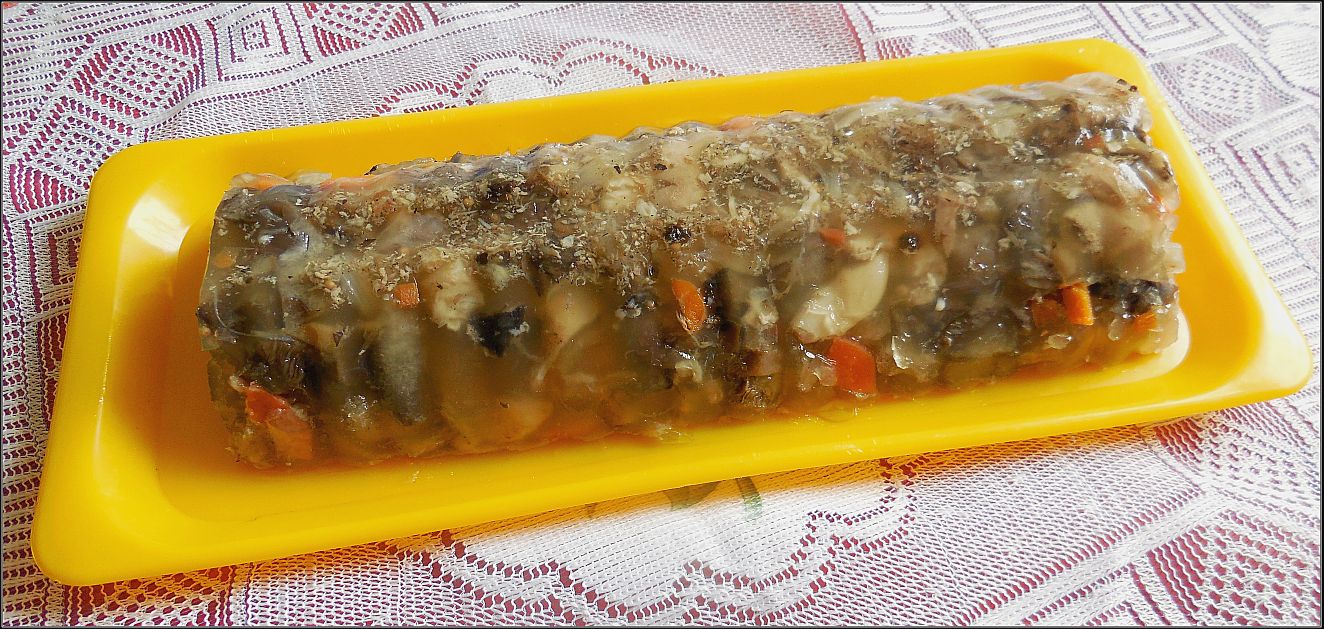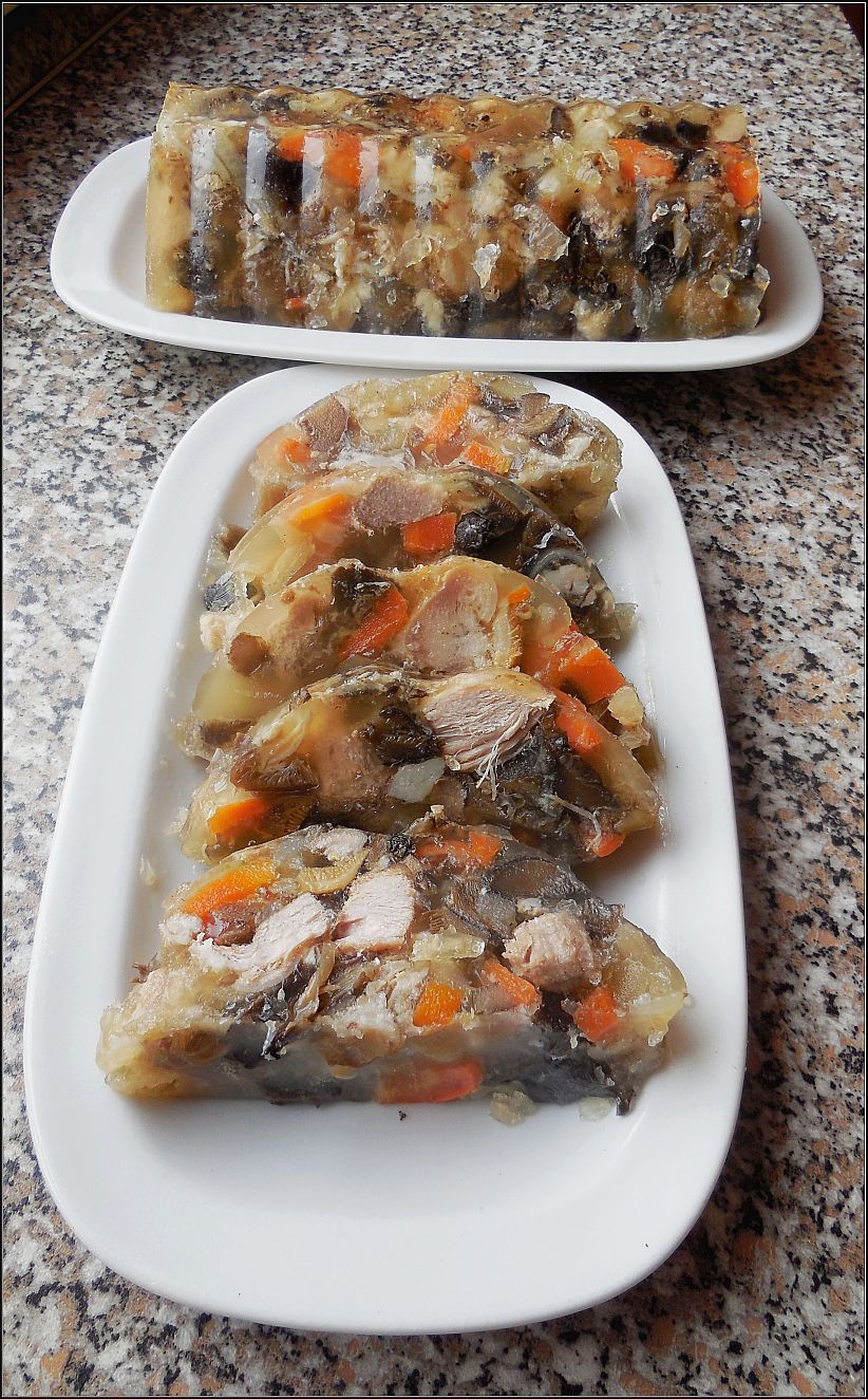 Postup: 1/ Vepřové nožičky řádně očistím a dám je vařit do slané vody, kam v případě potřeby přidám celý pepř, nové koření, bobkový list- vše přiměřeně. Nejraději vařím v papiňáku, jinak to trvá téměř 3 hodiny.Vařím tak dlouho až "maso" téměř samo odpadá od kosti. Pro vylepšení chuťových buněk mlsných jazýčků je možné ještě společně s nožičkami vařit i vepřové maso, nejlépe kousek plecka. 2/ Po uvaření sleji zvlášť vývar. 3/ Oberu nožičky. 4/ Kromě libového masa choť vše umele na masovém strojku. Maso pokrájím na kostičky. 5/ Tuto hmotu přidám k vývaru z nožiček, nakrájím syrovou cibuli a mrkev, přidám pokrájené kyselé houby včetně nálevu. Někdy přidám i hrášek, popřípadě přileji vodu. 6/ Vše vařím tak dlouho až je mrkev i cibule měkká. 7/ Tuto hmotu naleji do libovolné nádoby a nechám ztuhnout. 8/ V případě nutnosti a potřeby je možno přidat i želatinu. Návod na přípravu je na obalu želatiny. 9/ Hotový pokrm je možno přichutit octem, pepřem, solí. Nejlépe nám chutná s čerstvým chlebem.