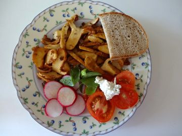 Pórek nakrájíme na tenká kolečka, prudce jej osmahneme na rozpáleném tuku, přidáme oloupané, na kousky nakrájené růžovky a společně vše udusíme doměkka. Pak směs okořeníme, osolíme, zamícháme, opět urovnáme a rozdělíme na pět dílů. Na každém z nich usmažíme volské oko, odstavíme z ohně a posypeme strouhaným křenem. Podáváme se slaným pečivem. Zdroj kniha Houby Česká enciklopedie