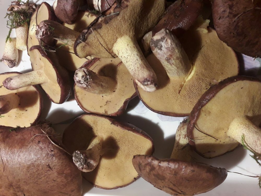 - Dole: Klouzek žíhaný (Suillus colinitus)nebo Klouzek zrnitý (Suillus granulatus)