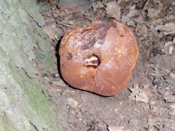 Kožovitá koule, hnědé barvy, vyrůstající u kmene dubu, po poškození vytéká červená tekutina.