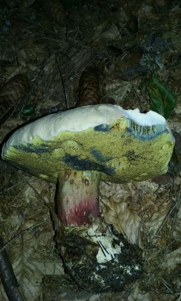 Byl to šumavský hustý les a dala bych krk za to, že byl smrkový, ale to by kolem houby nebylo listí. Dobrá tak smíšený, A našli jsme dík dešti který nás do hustníku zahnal 2 hrozny hřibovitých hub, které toužily být sebrány až na to, že klobouk zhora nebyl hnědý, ale smetanový .