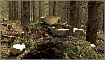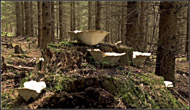 Kmen byl ohnutý a houby na něm ve výšce cca 50 cenťáků nad zemí. Jehličnany si teď nevybavím, ale cestou na Smrk se dá předpokládat, že tam určitě nějaké byly. ;)