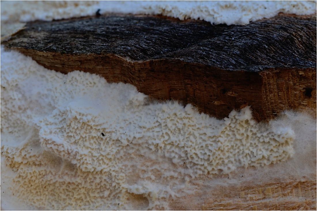 Na kmínku usychající osiky rostl tento povlak. Mladší a starší stadium téhož.
