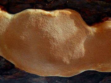 Řekl bych troudnatec pásovaný. Něco takového jsem na borovici také našel a nejdříve jsem uvažoval o Diplomitoporus flavescens, ale když jsem pořádně porovnal fotografie, uznal jsem, že tato utkovka má jiné póry a jinou konzistenci. Myslím, že Fomitopsis pinicola tohle může udělat a ty póry se dají nakoukat (vypadají prostě takto