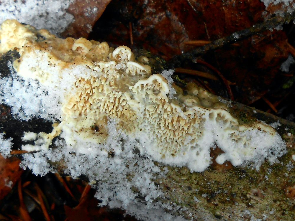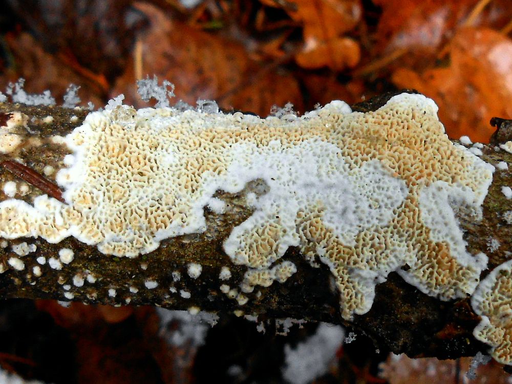 Na bukové větvi jsem našel tuto zajímavou houbu. Tvořila polorozlité plodnice (světle olivově zelená barva klobouku). Nejpodobnější, co jsem našel, je Antrodia albida.
