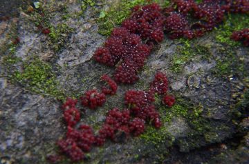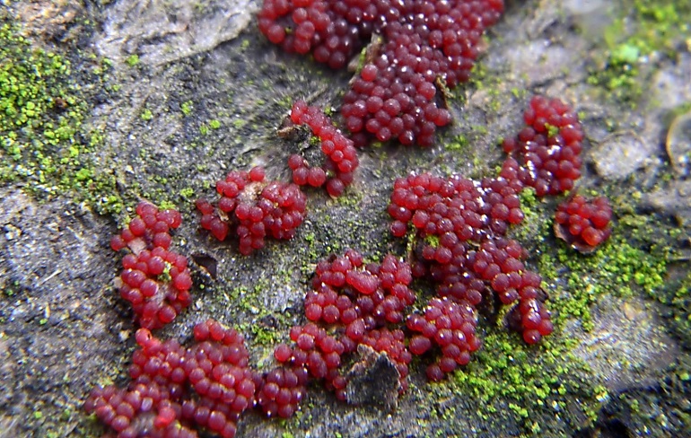 Může se jednat o Nectria coccinea? Rostla na kůře tlusté ulomené bukové větve spadlé na zem.