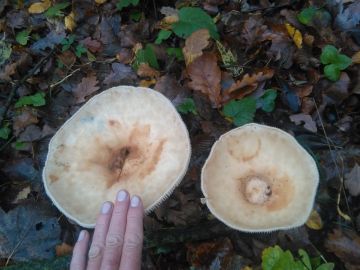 Dneska jsem našel skupinu velikých hub, domnívám se, že to je Clitocybe geotropa. Voní nasládle. Lokalita: u silnice z Lhoty p. Kosířem do Drahanovic, listnatý les.