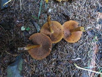 Cortinarius ano, semisanguineus ne (ten by měl lupeny daleko výrazněji červené). Chtělo by to mít po ruce i úplně mladou plodnici, ta je u těch Dermocybek pro určování často dost zásadní. Tyhle plodnice už jsou na určování poněkud starší. Mohl by to být Cortinarius cinnamomeus, ale bylo by potřeba zjistit, jestli měl oranžové lupeny už v mladém stádiu, nebo jestli byly původně žluté a oranžovou získaly až po dozrání.