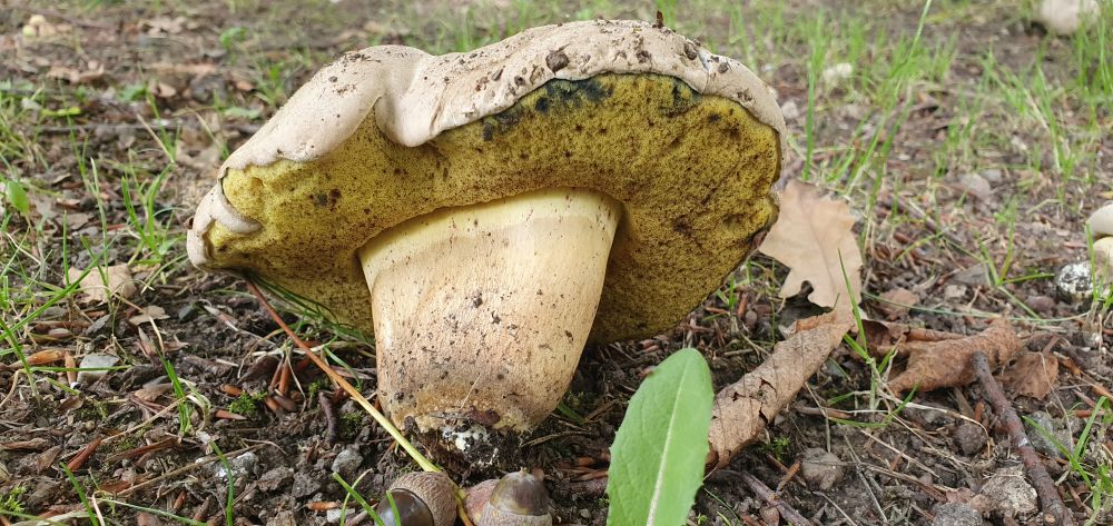 Na řezu modrá. Na chuť úplně jemne nahořklý, ale nevím jestli jsem to tam jen nehledal. Biotop v parku v centru českých Budějovic pod dubem.