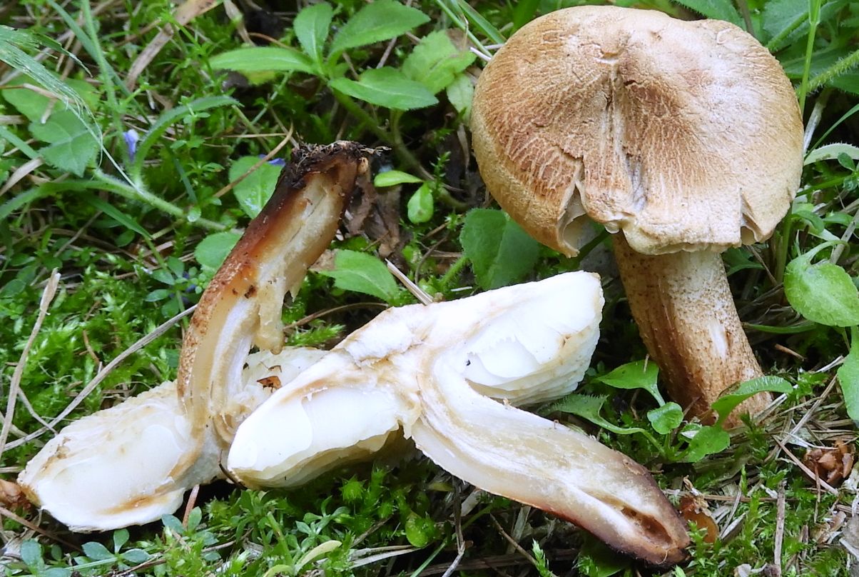 Nějaká lupenatá houba, možná, by to mohl být nějaký ryzec. Chtělo by to fotku lupenů, třeně, a pokud z toho teče nějaké mléko, tak i to mléko (jakou má barvu hned po rýpnutí do houby, a jestli se barva za pár minut nezmění).