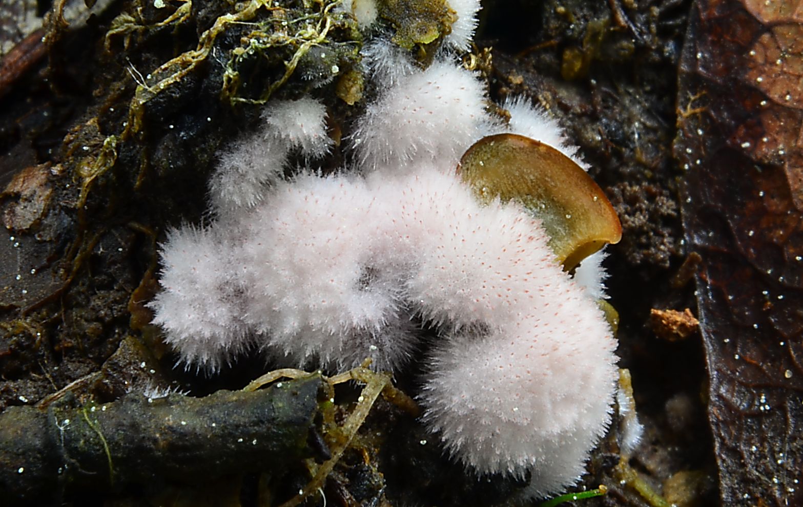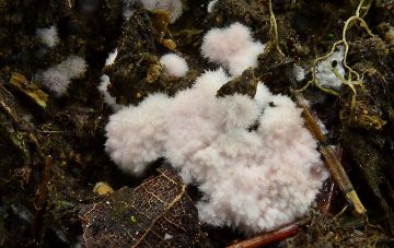 Díky Aleši, bělochoroš neé, tohle do 1cm na výšku roztroušeně povlaky na zemi a listí hodně fotogenické, a tak jsem to cvakl-nějaký druh plísně.