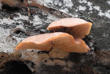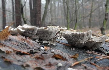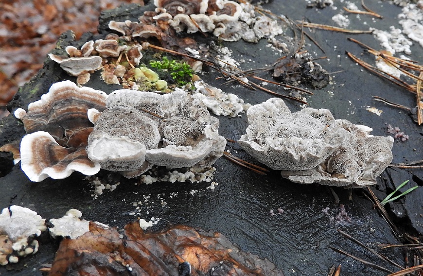 To úplně nalevo je outkovka pestrá (Trametes versicolor), to druhé by snad také mohla být, i když trochu netypicky vyvinutá.