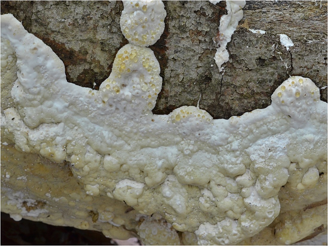 Na ležícím bukovém kmenu tento, částečně gutující povlak. Na délku více než 1 metr.