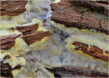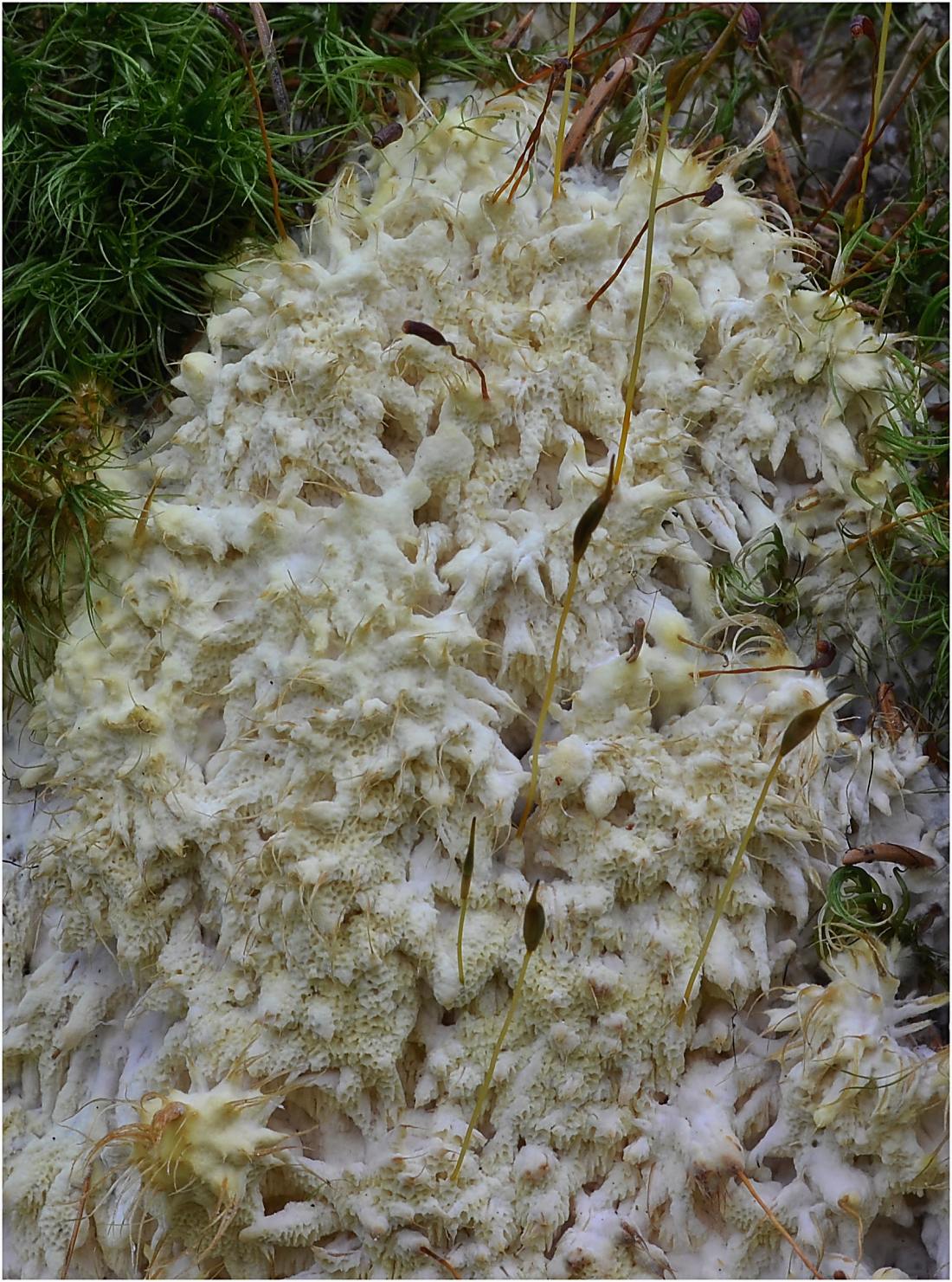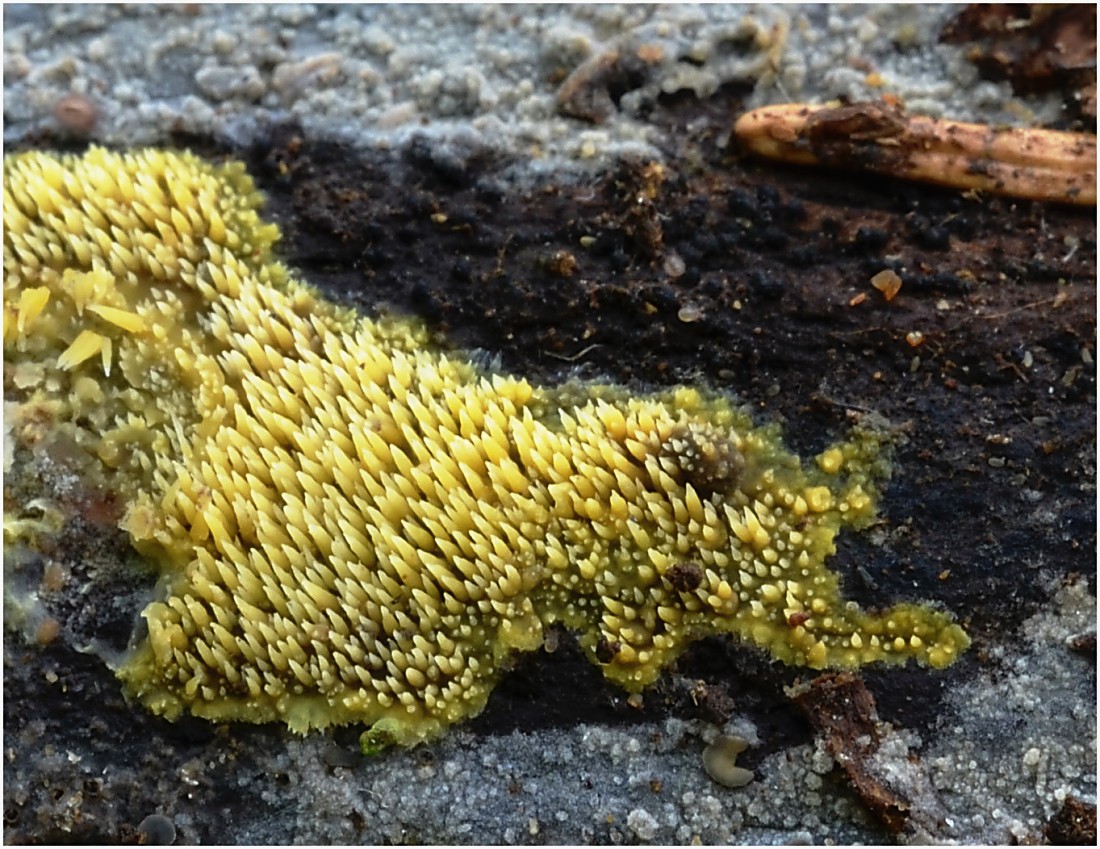 Tento žlutý povlak pokrýval mechorosty, větvě a pařezy ve středně staré, prosvětlené smrčině.