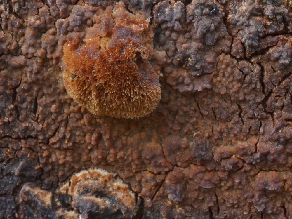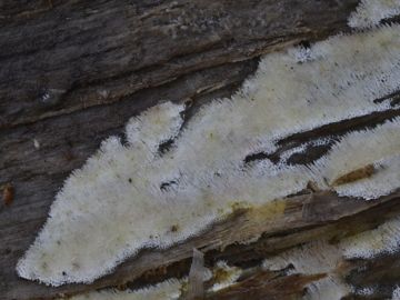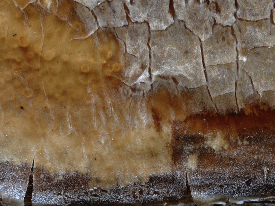 Tady bych jen tak od oka tipoval Hyphoderma setigerum, ale mikroskop nutný. To pod tím je ale pórovité, takže nepřipadá mi, že by to byly tytéž druhy.