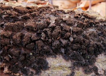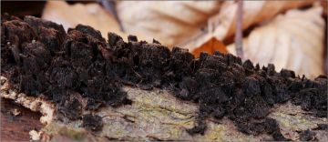 Omlouvám se za nekvalitní foto, vzrůstaly ze zbytků rozpadlé opukové zdi, okolní stromy olše a duby. povrch černé tvrdé strupy vnitřek bílý bez zápachu plodnice nejspíš staré a proschlé.