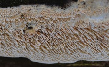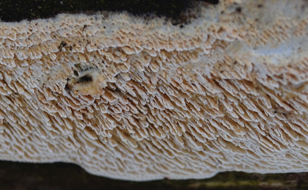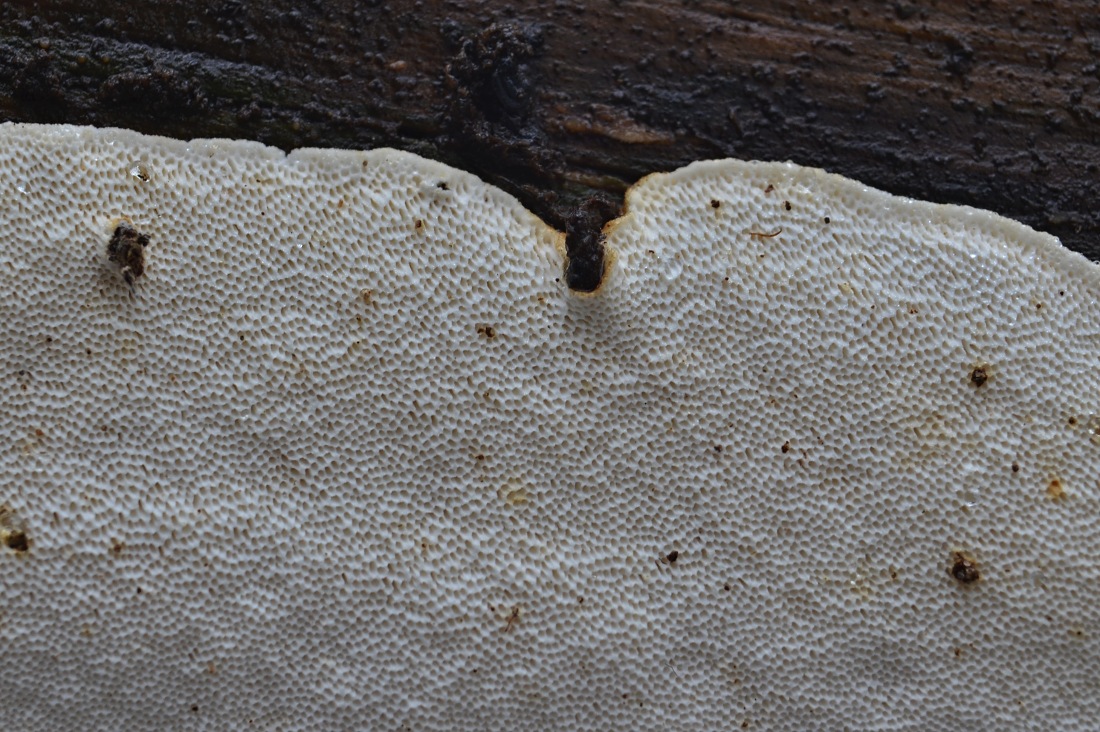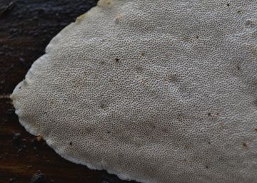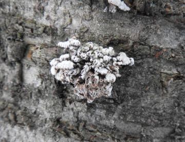 Naopak na kmeni listnáče již bez kůry, nález tohoto čistě bílého houbového povlaku velikosti