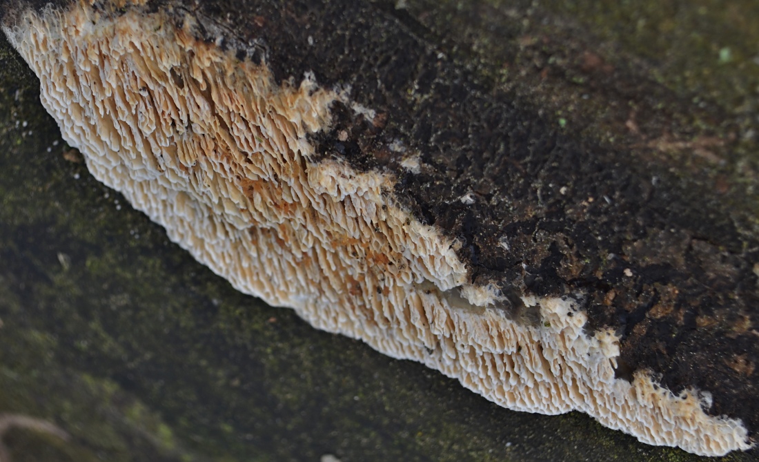 Ještě jeden druh, se kterým si nevím rady. Tato houba rostla na suchém kmenu třešně. Vyfoceno 20. 1. 2018.