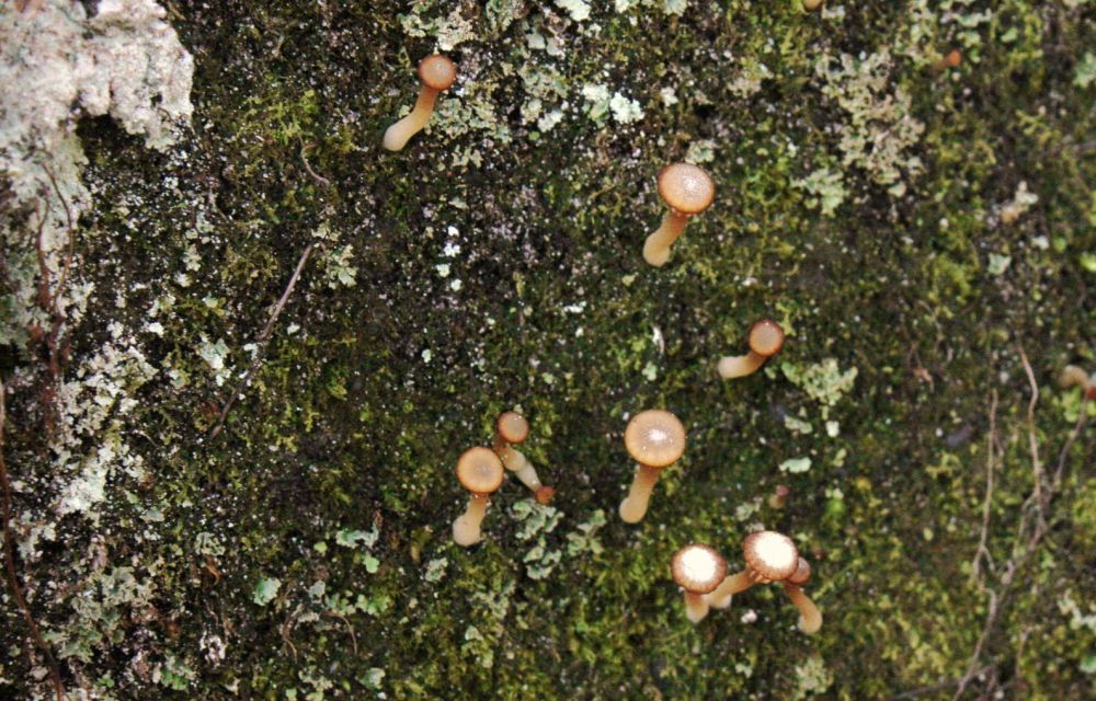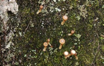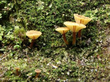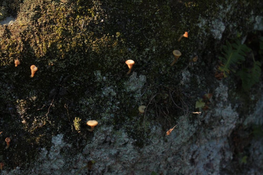 Vypadá to, že to roste ze skály, takže samotinkou houbu můžeme vylučuje (neměla by se tam jak uživit). Je to lišejník Lichenomphalia sp (nejpravděpodobněji umbellifera). Ze stélky opravdu vyrůstají kalichovkovité plodničky. Jejich růst je ovšem podporován fotosyntézou ořasené stélky, která se plazí po povrchu té skály.